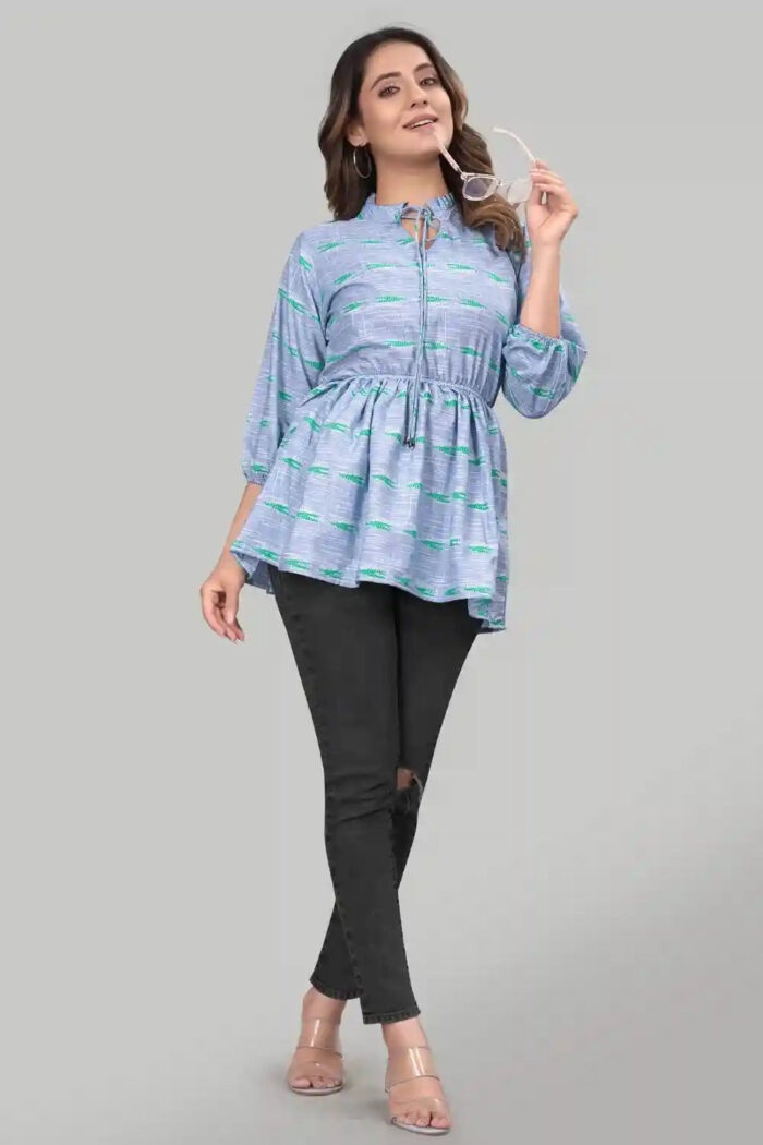 The ZELZIS Blue Ethnic Motifs Floral Printed Peplum Top is designed for women and girls who love a blend of elegance and comfort. Made from lightweight crepe fabric, this top provides a soft and breathable feel, ensuring all-day ease. The beautiful ethnic motifs floral print adds a touch of charm, while the trendy tie-up neck enhances its stylish appeal. The bishop sleeves create a graceful and sophisticated look, making it perfect for both casual outings and festive occasions. Its flattering hip-length peplum design pairs well with jeans, trousers, or skirts for a versatile and fashionable outfit. Easy to maintain, this top can be washed by hand or machine, ensuring long-lasting wear. Proudly made in India, this piece is a must-have addition to your wardrobe.
